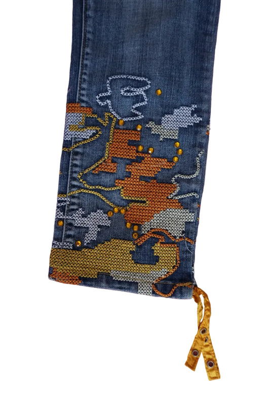 Vintage Blue and Silver Flames Low Rise Jeans - Size 1