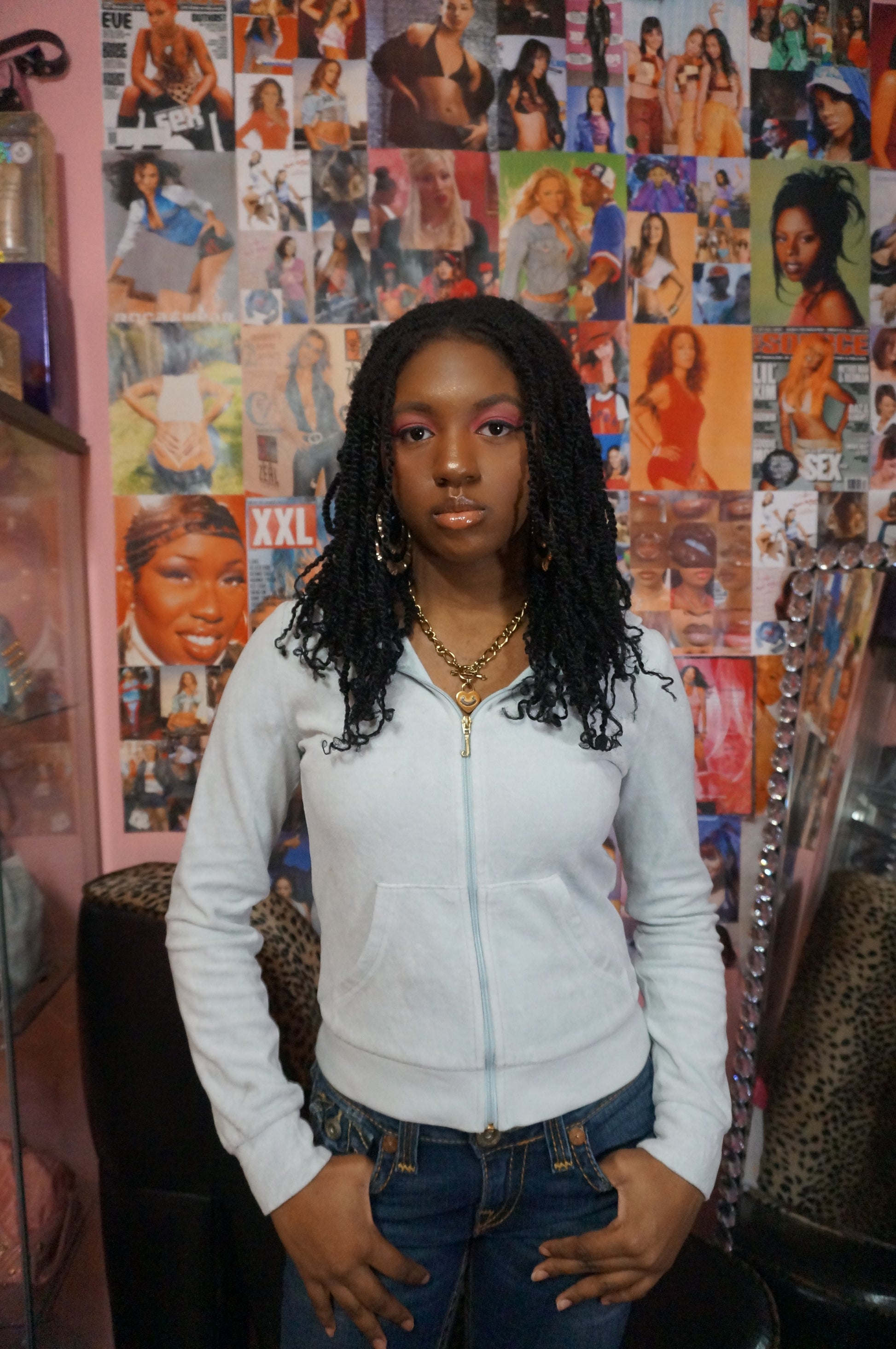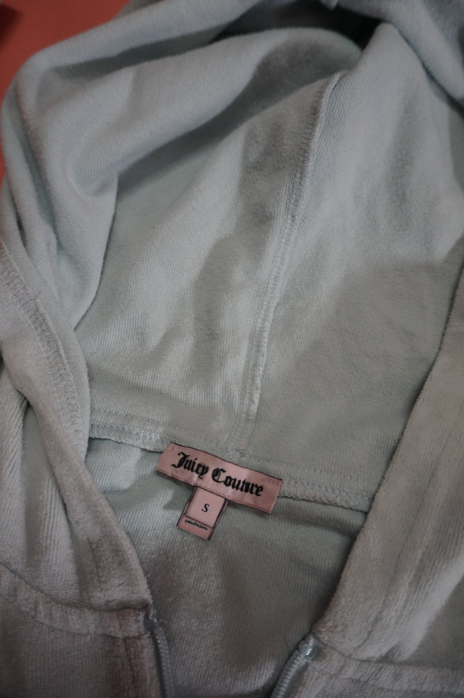 Powder Baby Blue bootleg Juicy Couture velour zip up sweater with the iconic J pendant on the zipper and gold font at the back. Style with your favourite pair of low rise jeans, UGG boots and accessories.