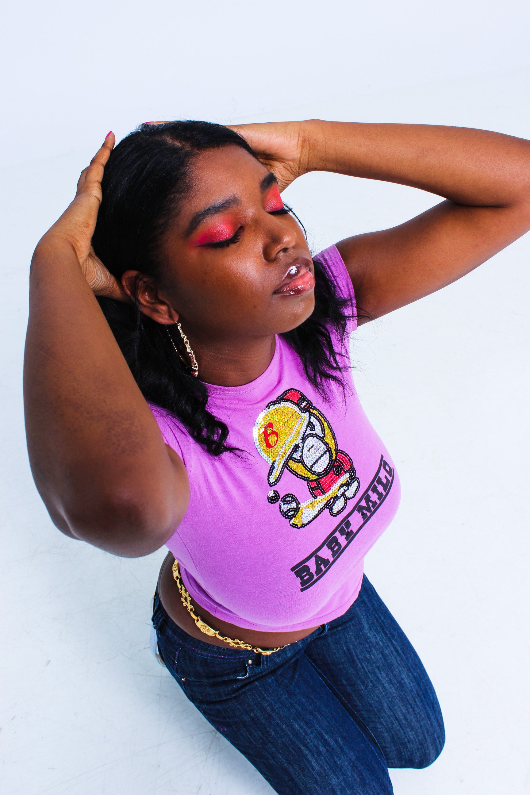 Purple Bape Baby Milo baby tee by Bape. This top has their logo on the front with glitters. Celebs like Pharrell, Jay Z and Wiz Khalifa wear their brand.