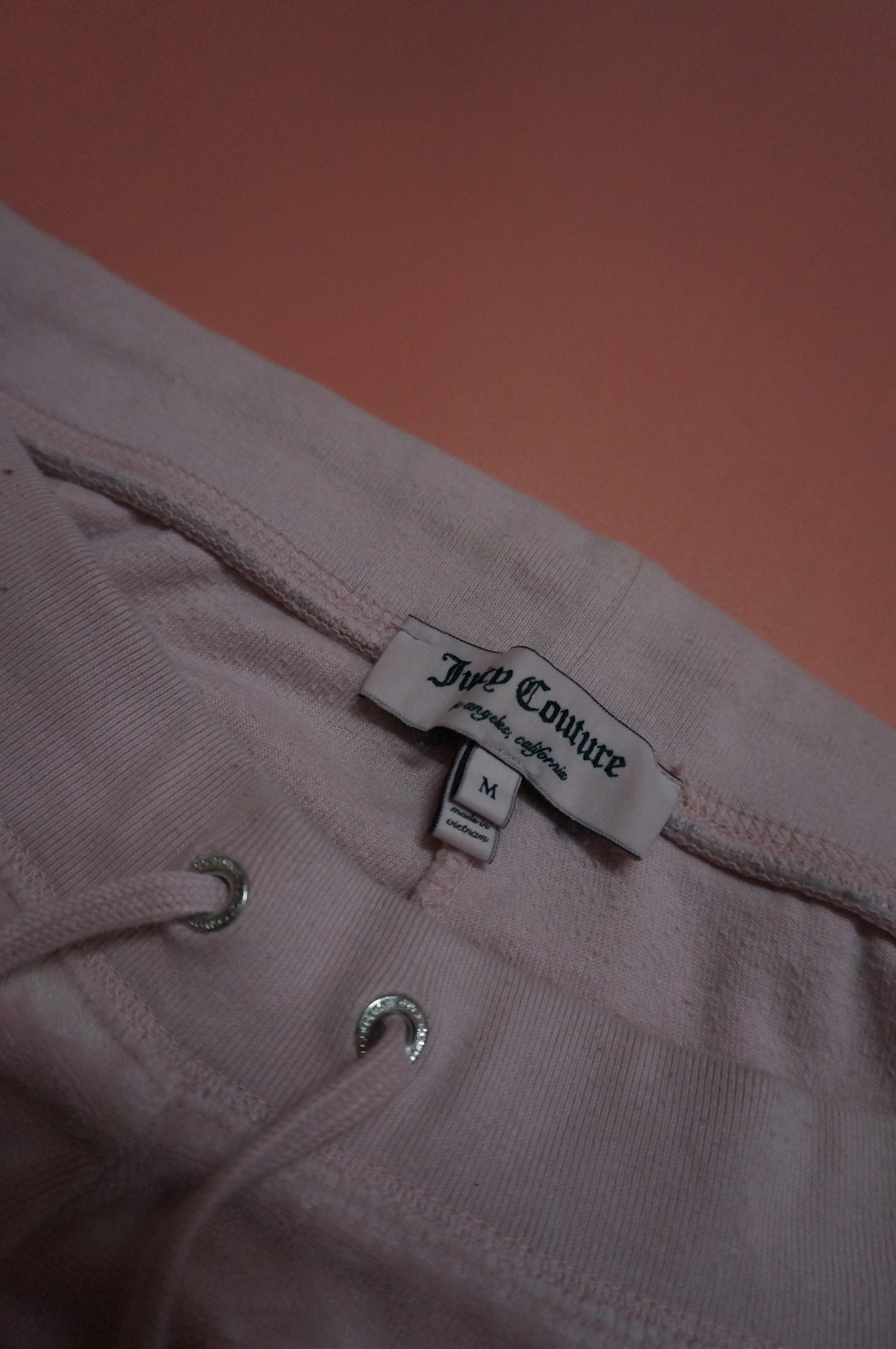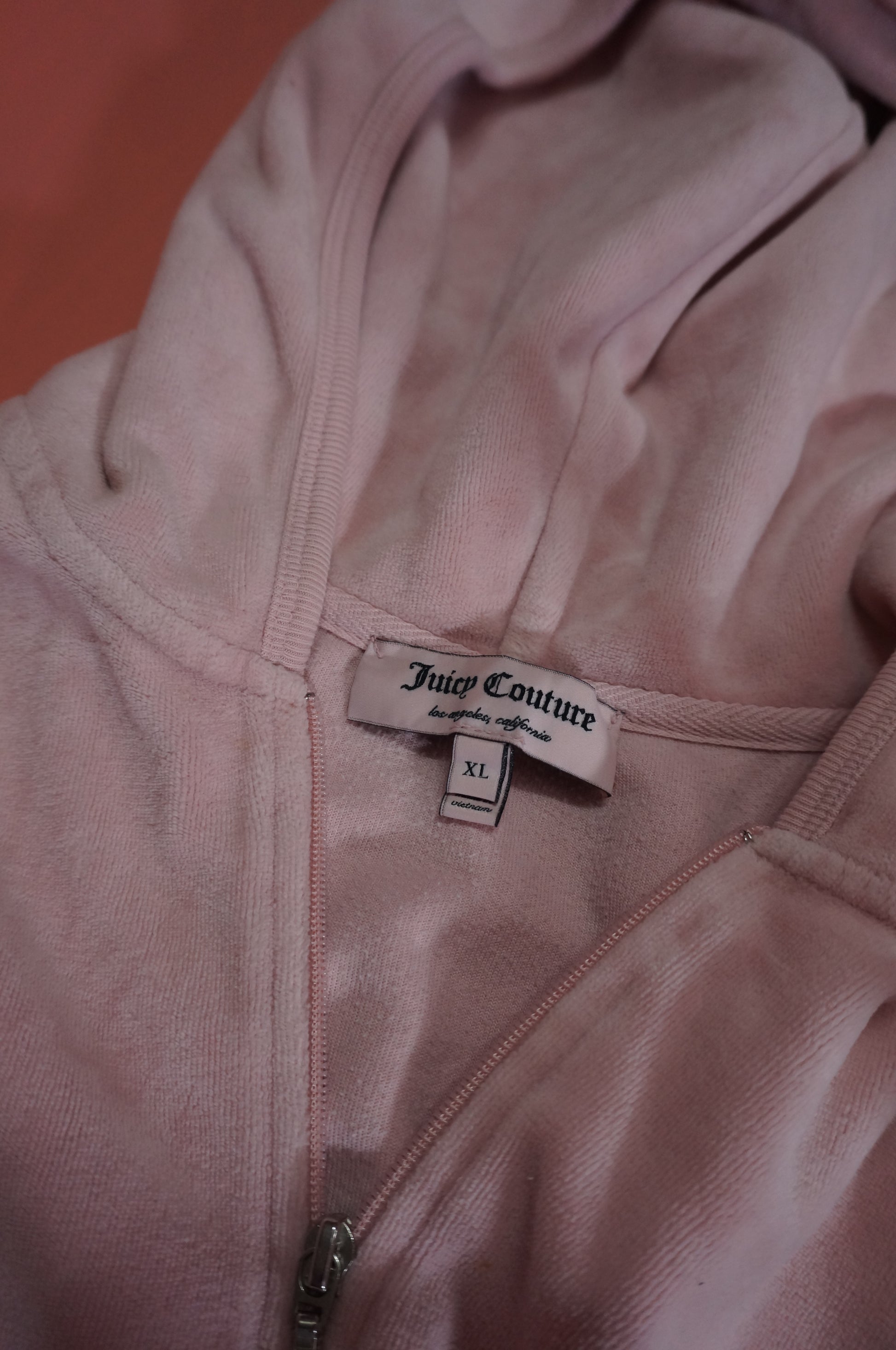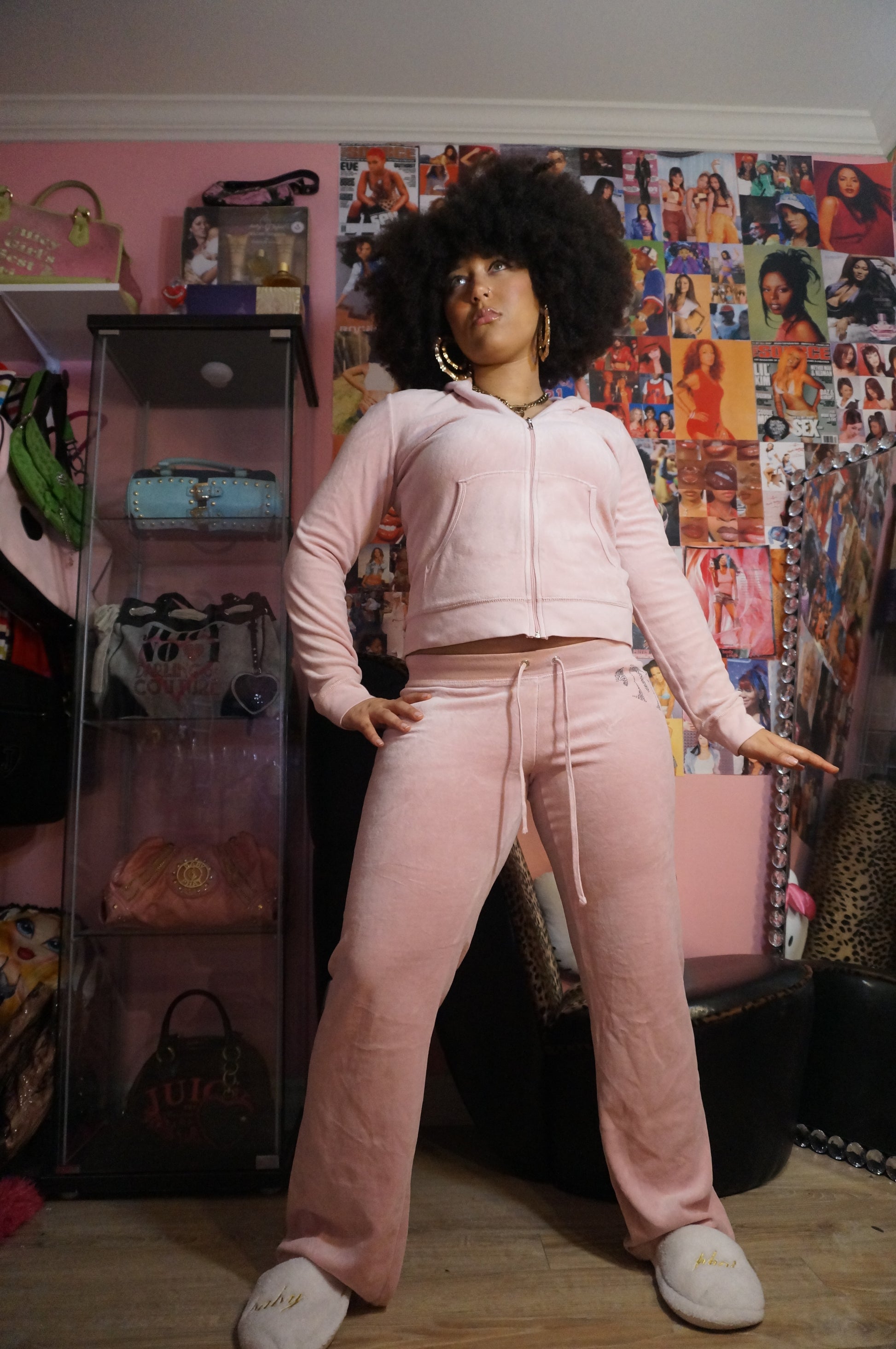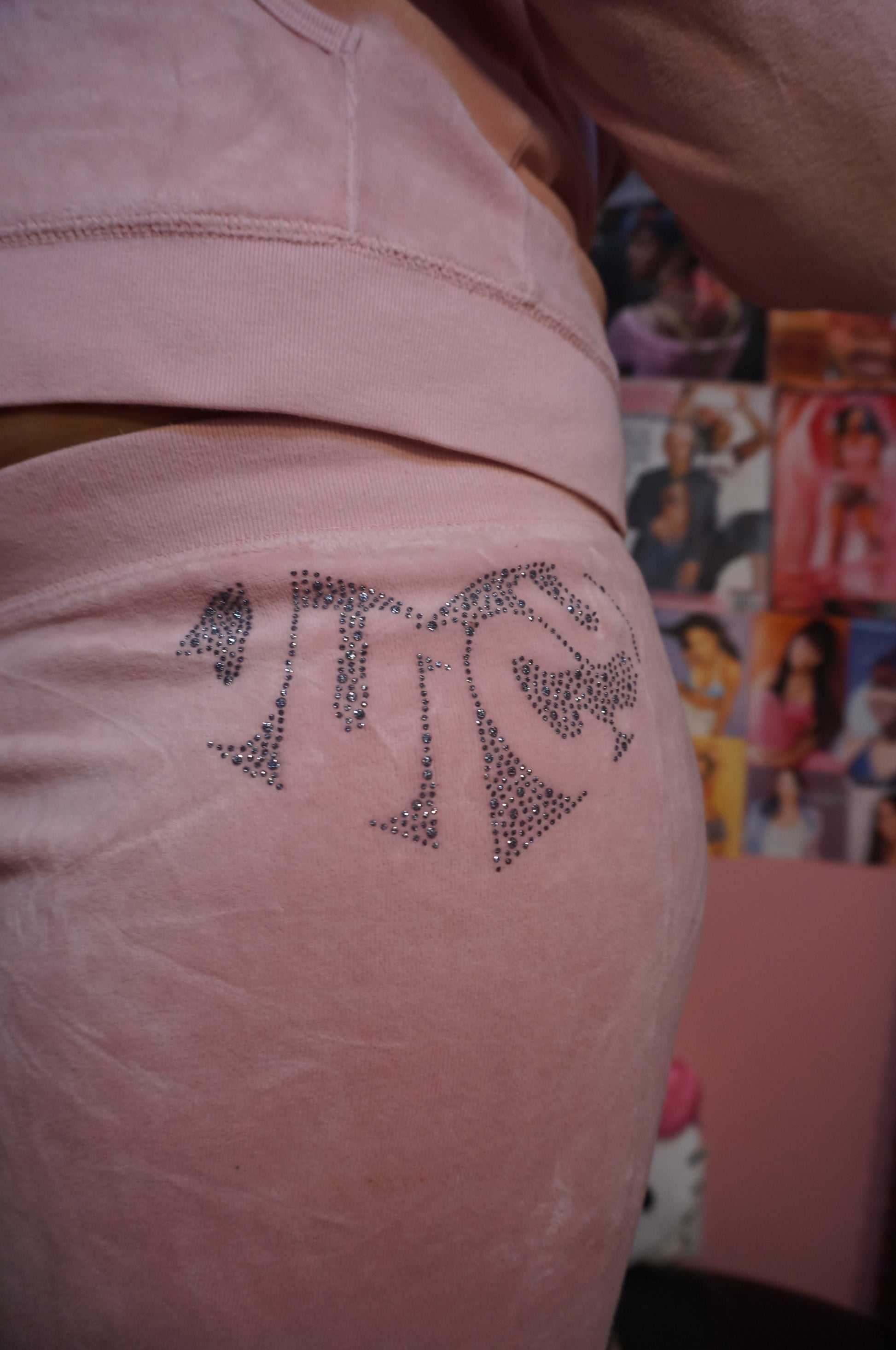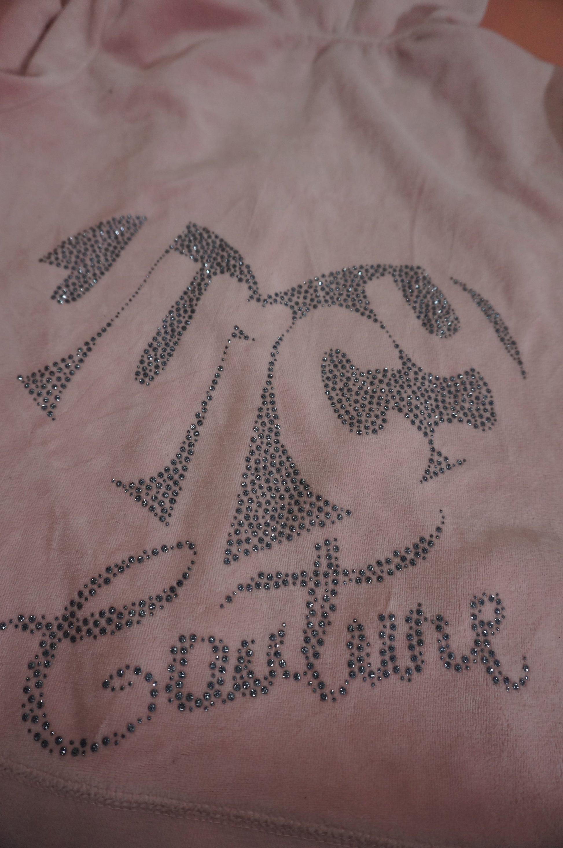 Lovely Baby Pink Juicy Couture Velour Tracksuit set with silver glitter print on the back of the top and front of the bottoms. This set is great for the days that you want that glam polished look and need to step out the house to get your hair or nails done or simply to run errands.
