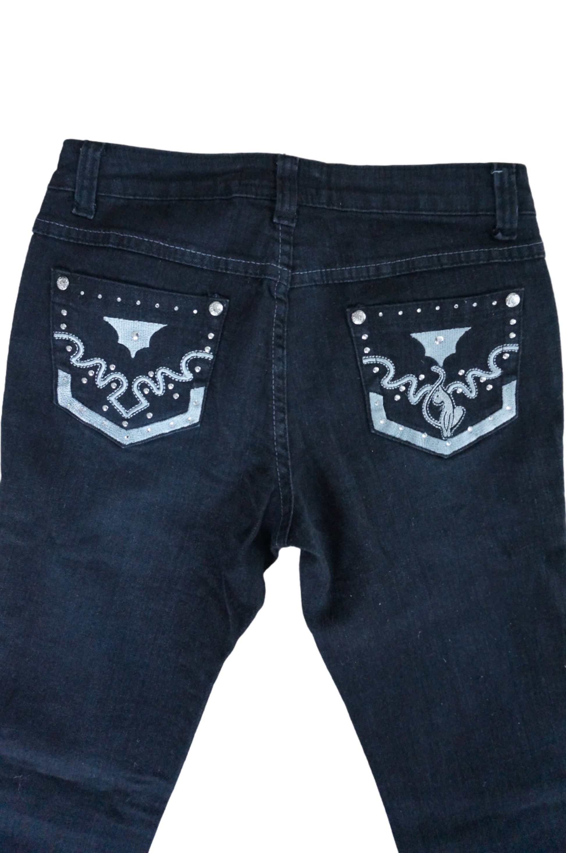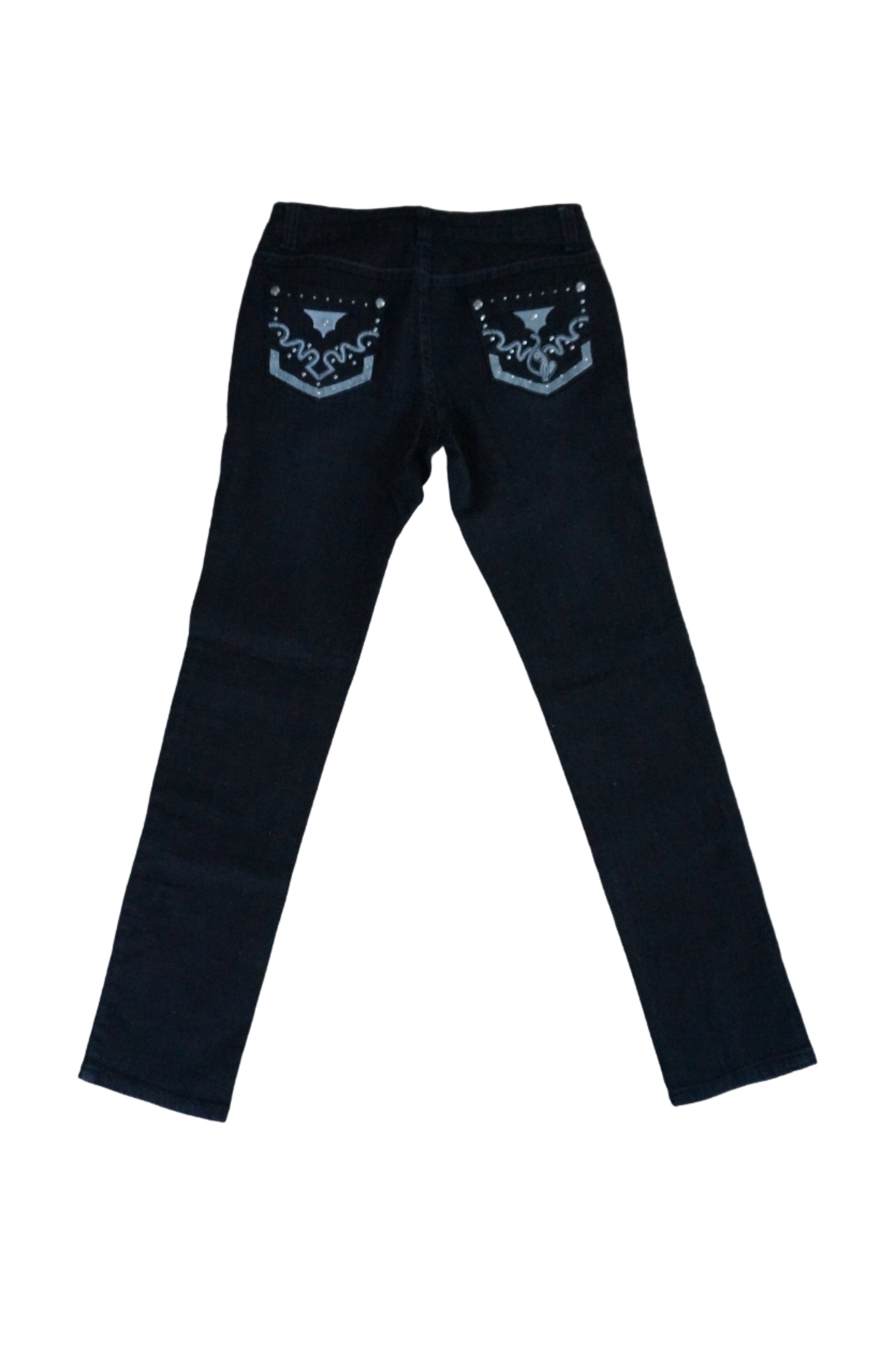 Black Baby phat skinny jeans with silver detailing and the cat logo on the back pockets. Style them with stilettos, booties or a knee high boot.