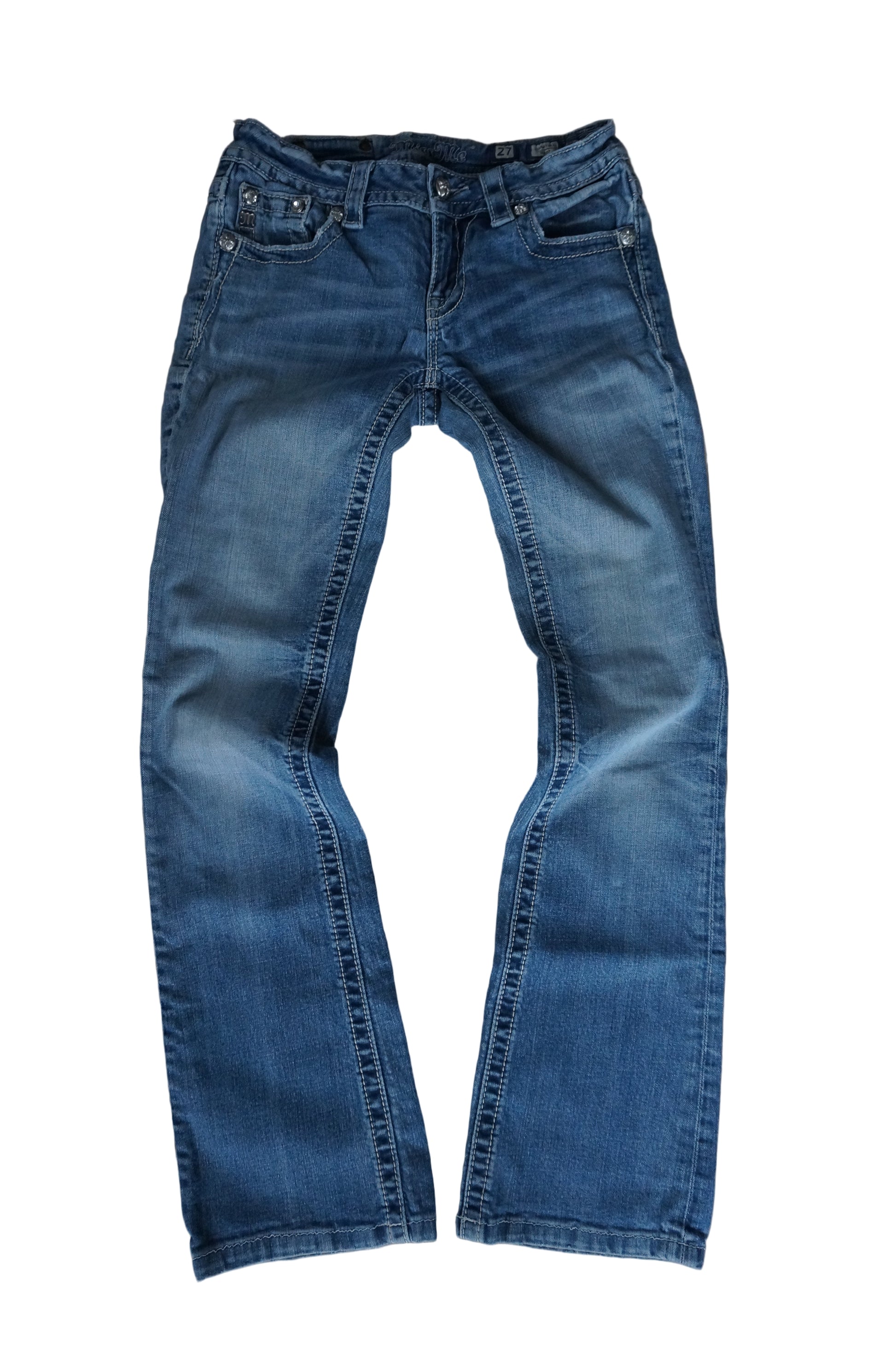 Vintage Miss me jeans silver leather patterned swirls and floral patterns with micro pearls on the back waist area and the back pocket flaps.