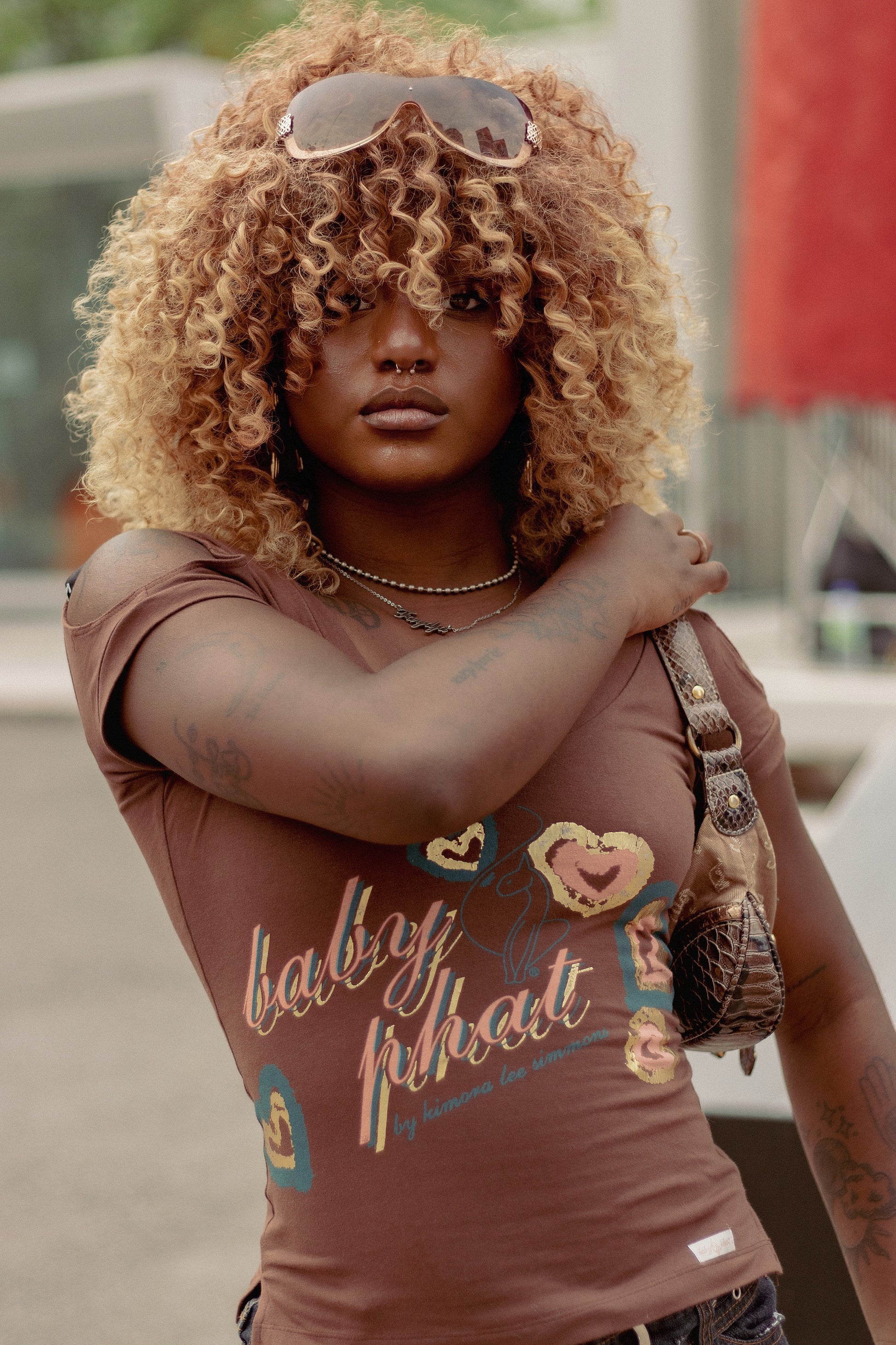Brown Baby Phat tee with gold, pink and aqua print. It has a V neck cut at the the front as well as cut out the the shoulders. Are you even a 2000s Baddie if you don't own any Baby Phat ?