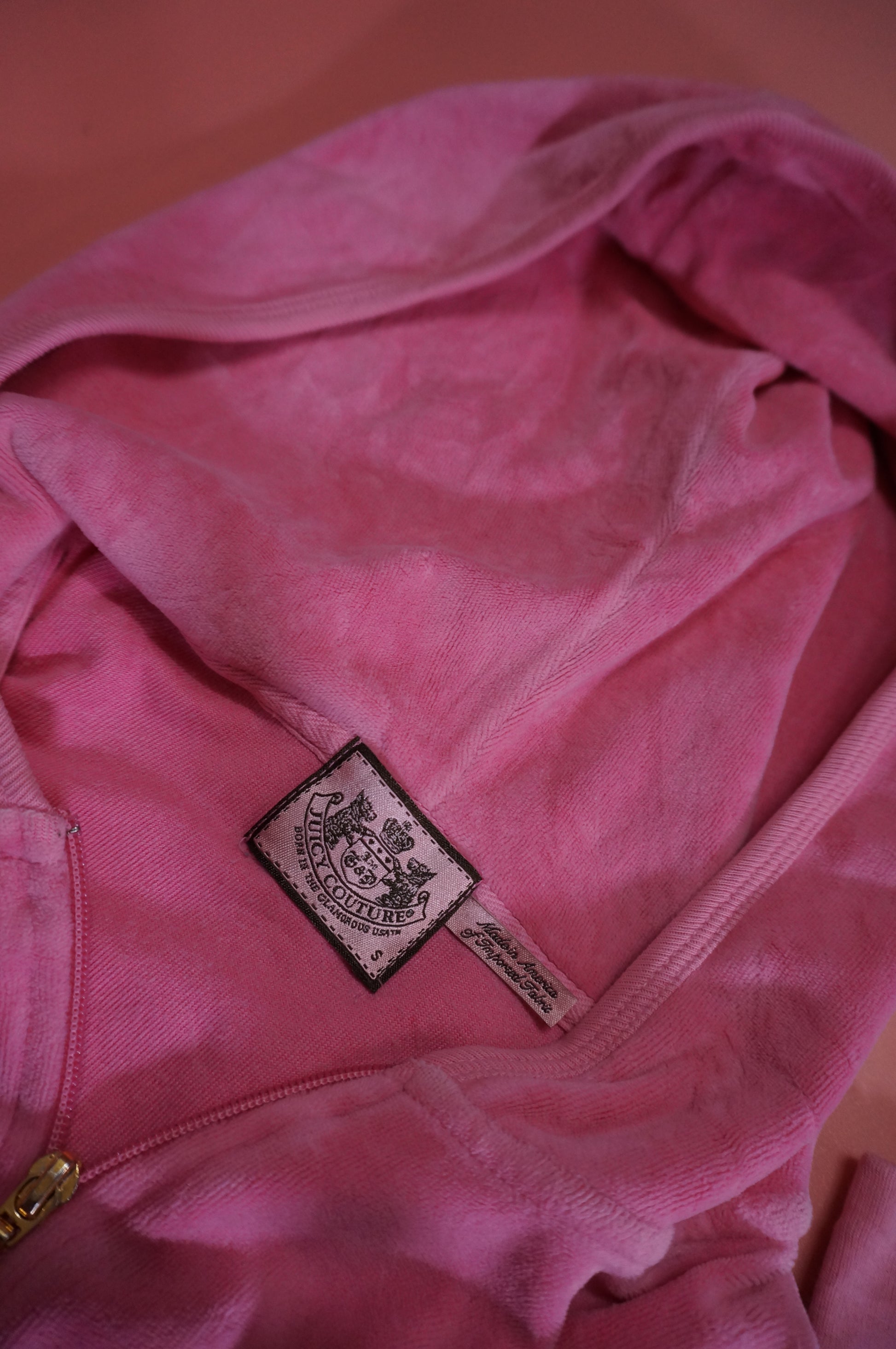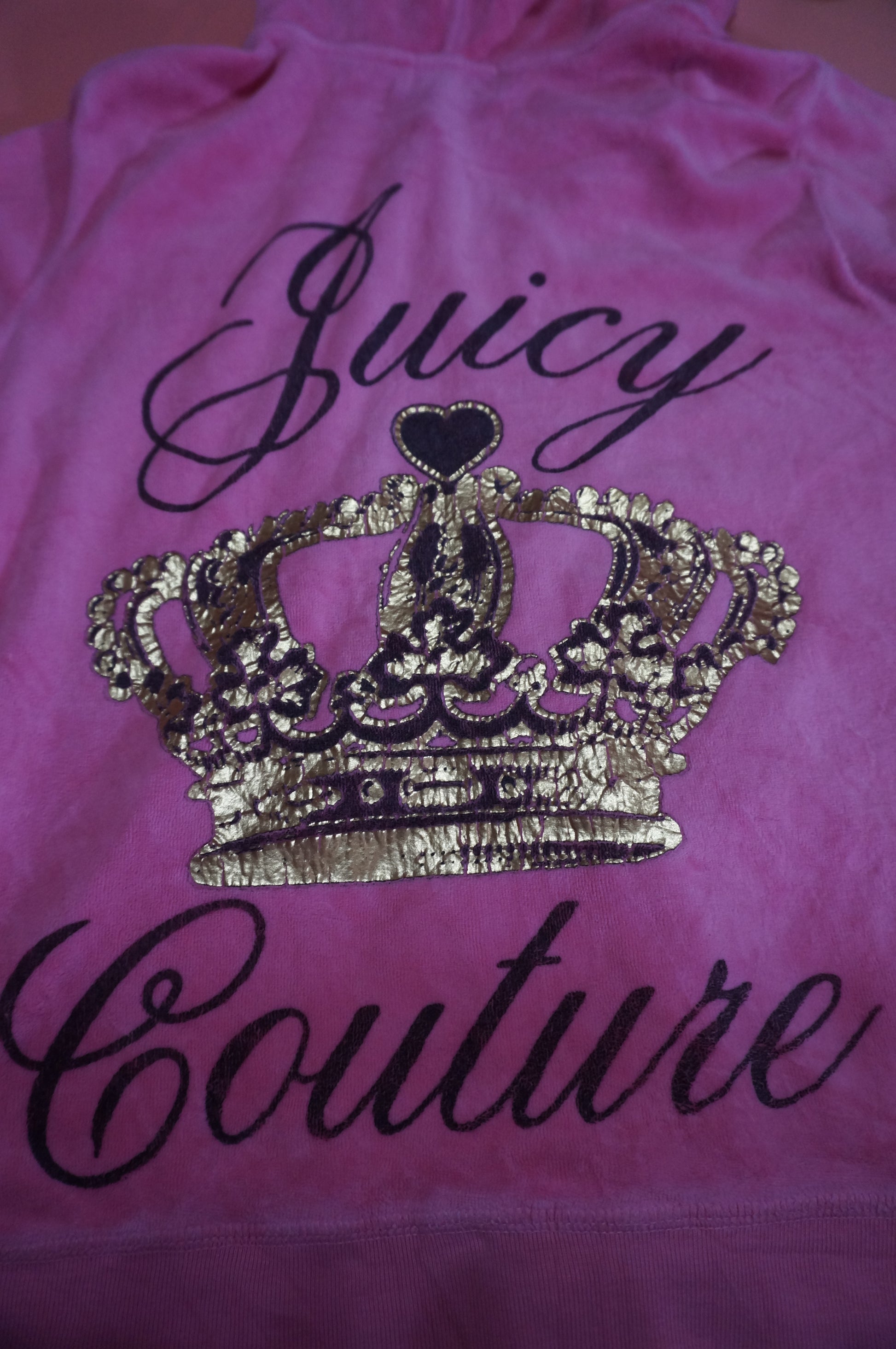 Glam pink Juicy Couture track jacket with iconic J pendant with the cutest print at the back. The juicy font with the gold crown is so fabulous. Pair the jacket with a mini skirt, with sheer tights underneath, UGG boots and gold accessories or pair with your favourite vintage low rise flare jeans and pointed heels for a classic Mariah Carey look.