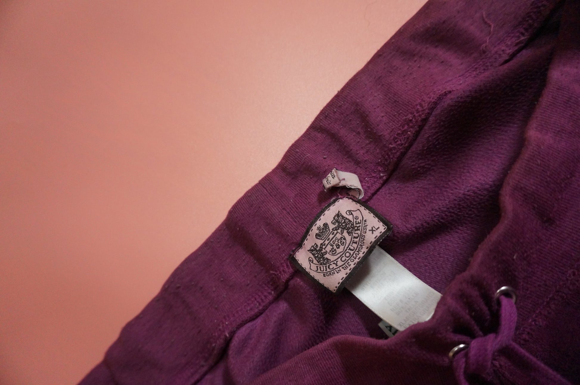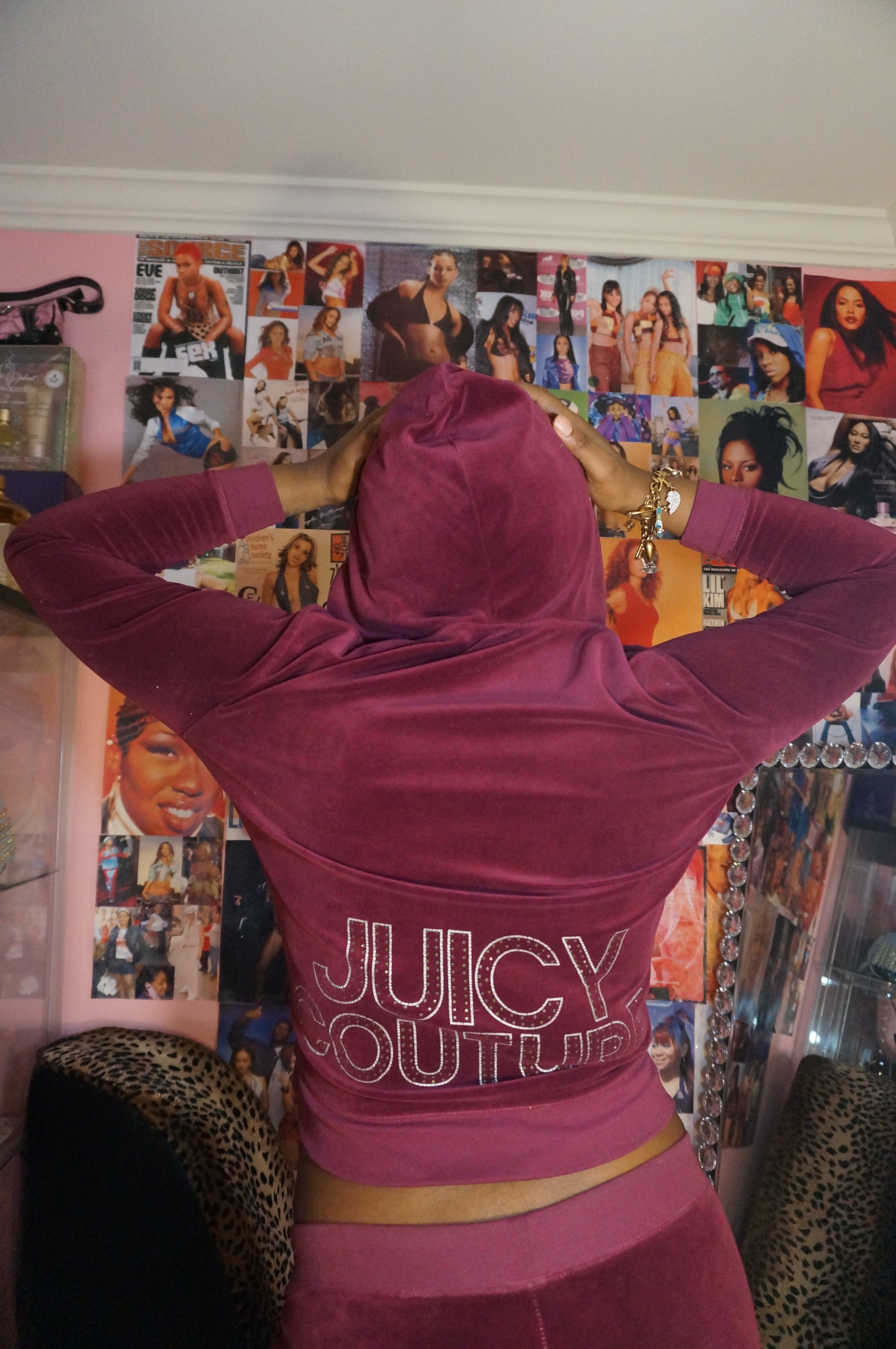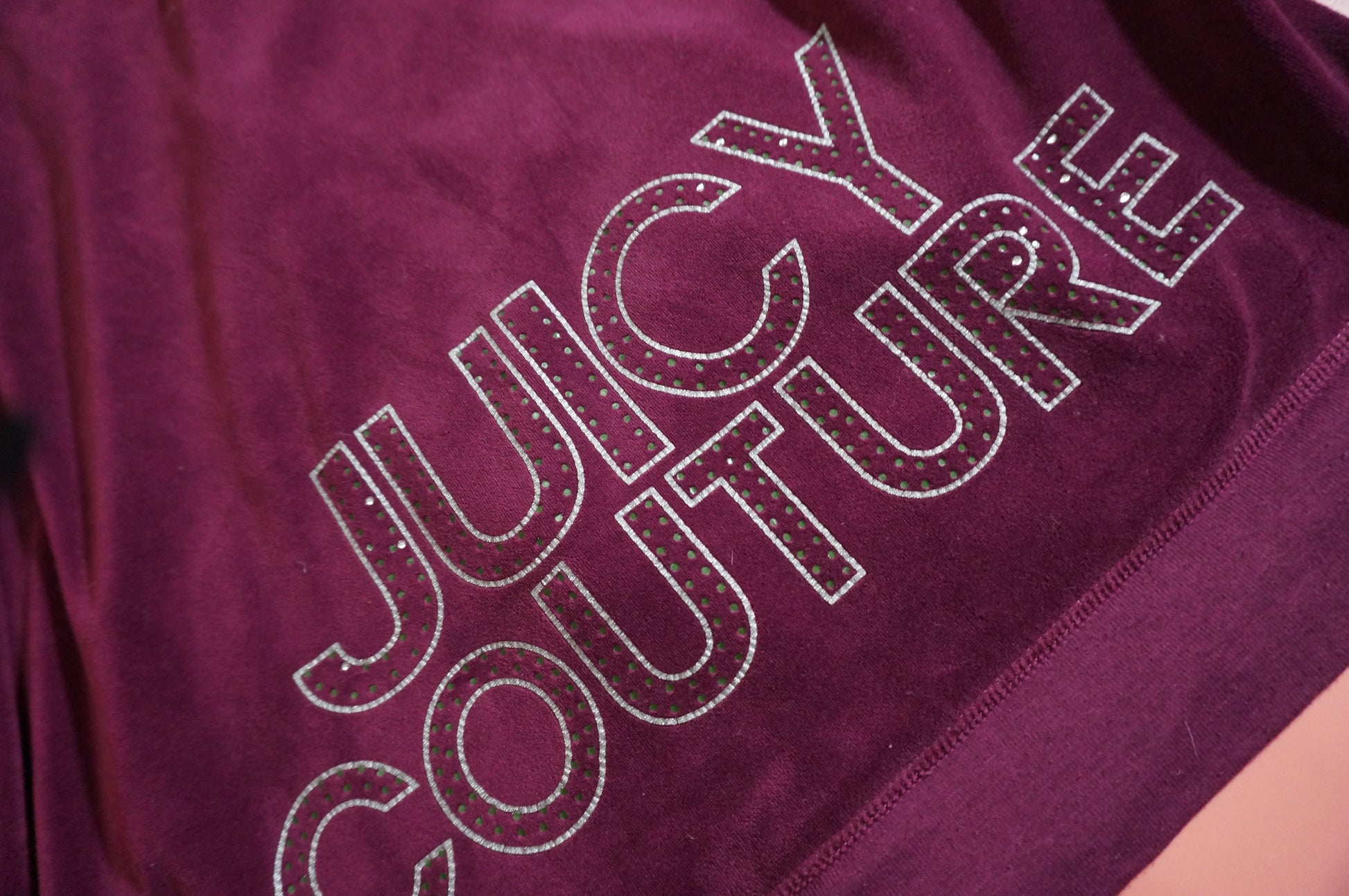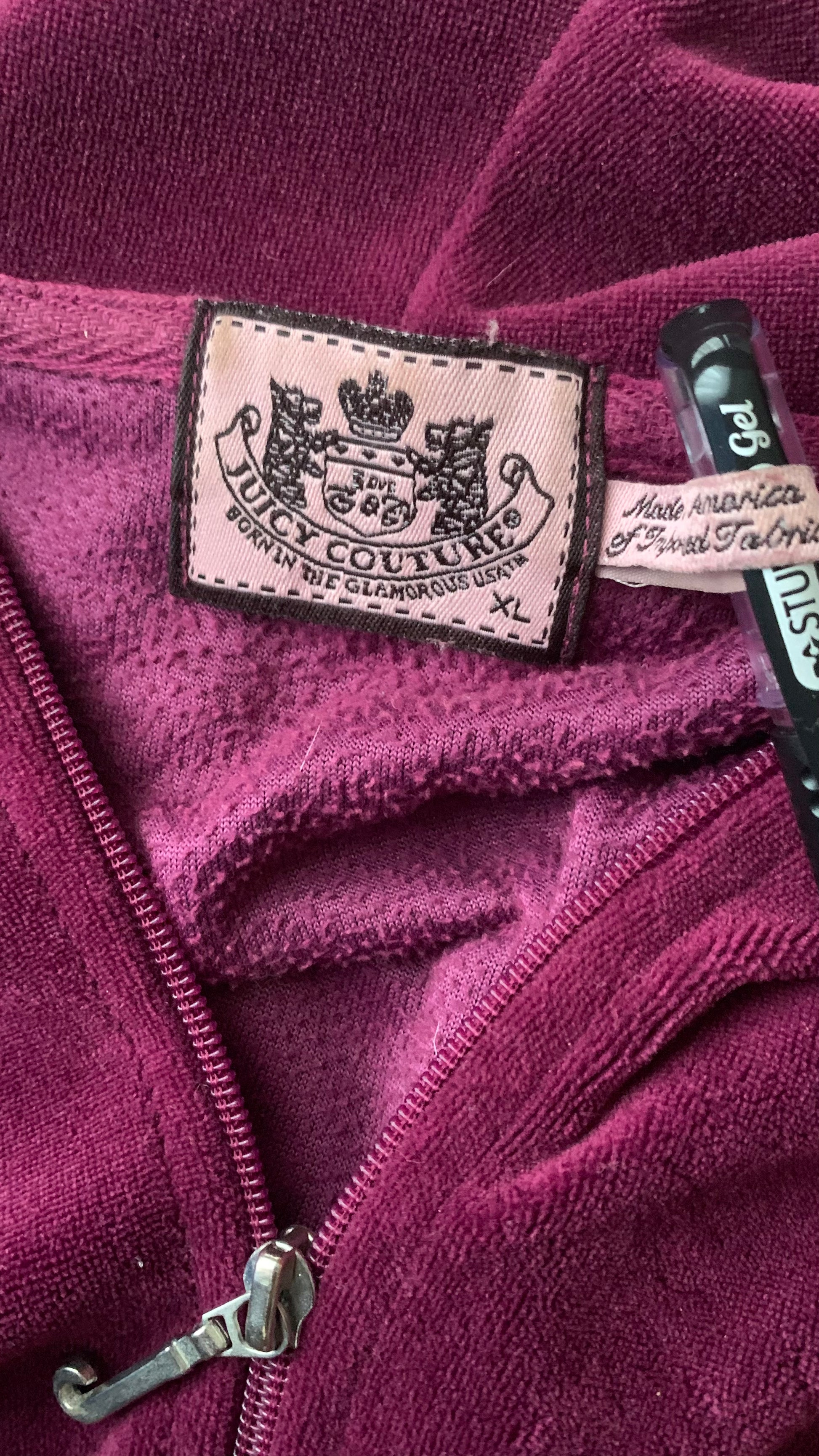 Get glam and cozy in this Burgundy Juicy Couture Tracksuit! Made with velour, this soft tracksuit will have you feeling luxurious while staying comfortable. Perfect for lounging or adding a touch of glamour to your laidback look. (Tracksuit includes top and bottom.)