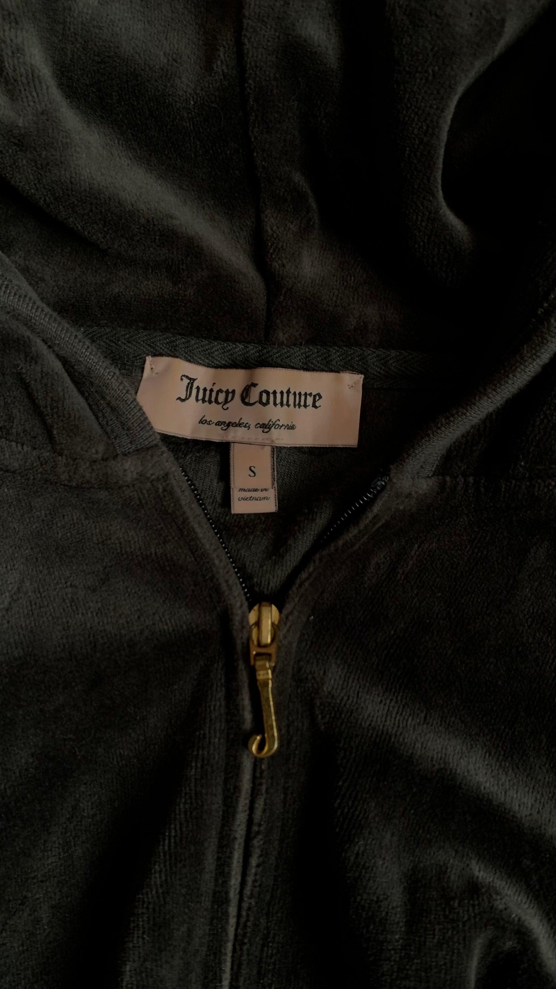 Experience ultimate luxury and boldness with our Dark Grey Juicy Couture Track Jacket. Elevate your wardrobe with a glamorous twist in this stunning jacket. It has the iconic J zipper pendant and a gold glam design on the back.