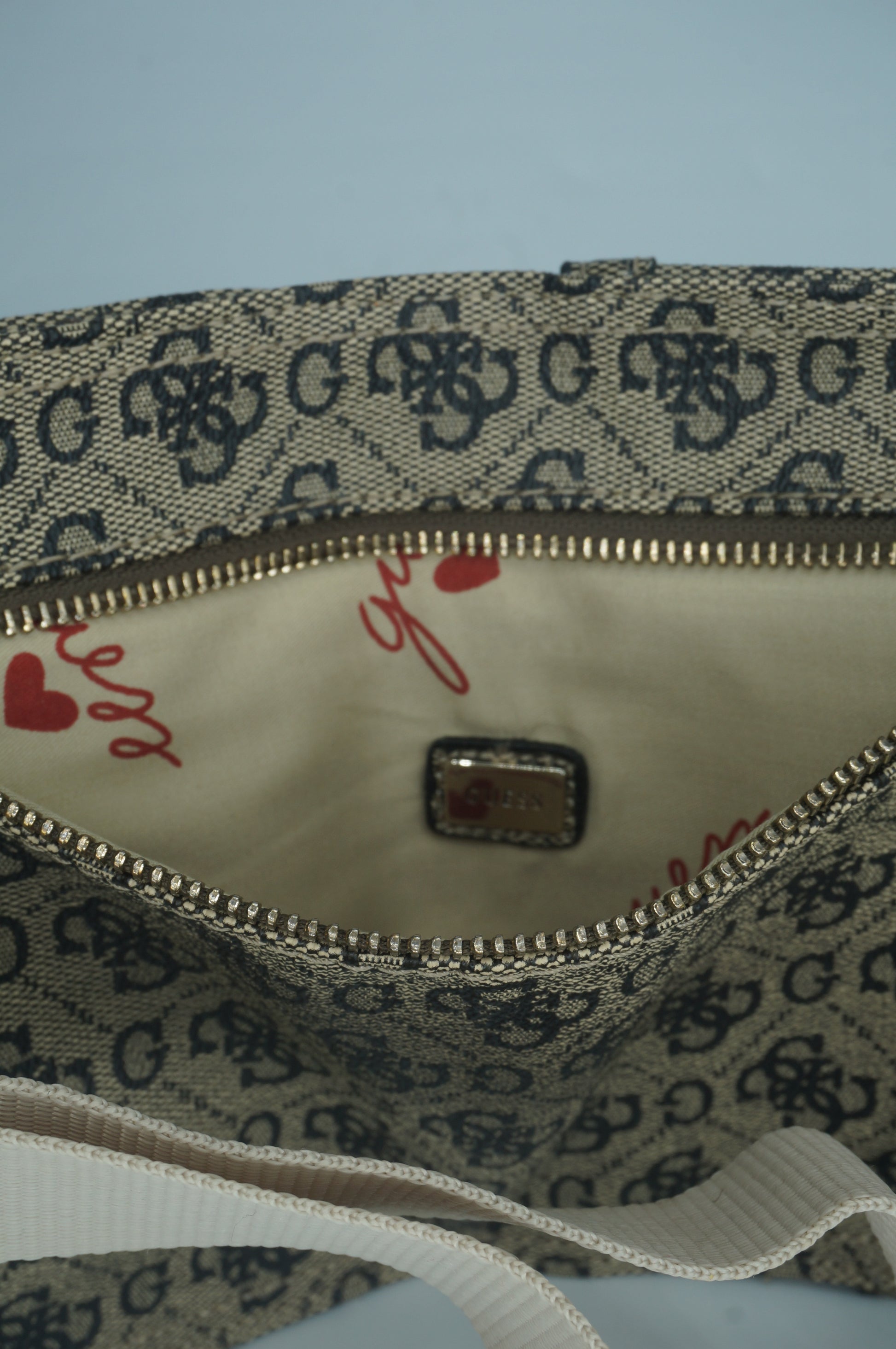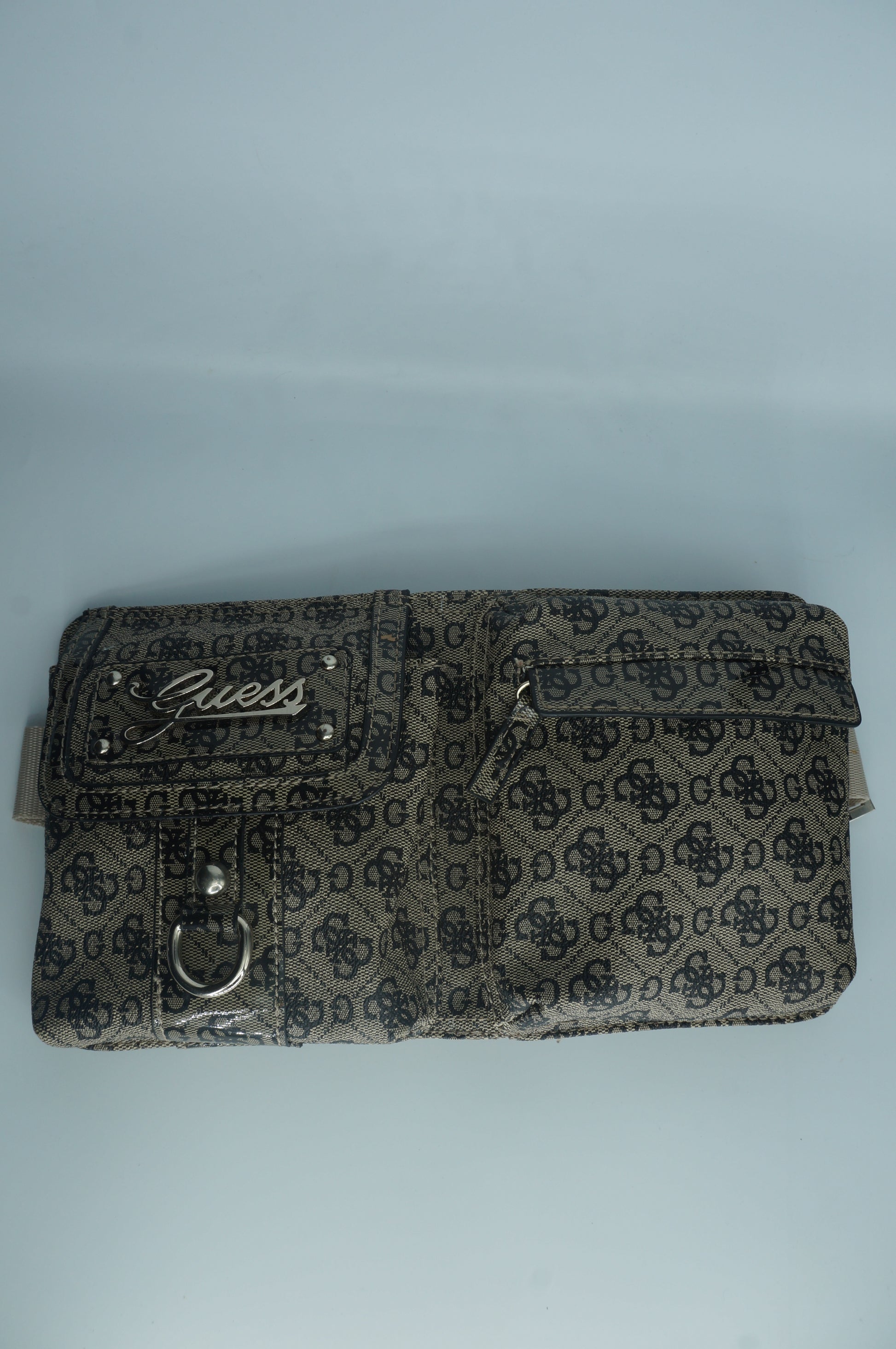This grey and black monogram guess belt bag has two large front pockets. One with a zipper closure, the other with metal clasp closure and there’s an additional pocket featuring a zipper closure at the back.