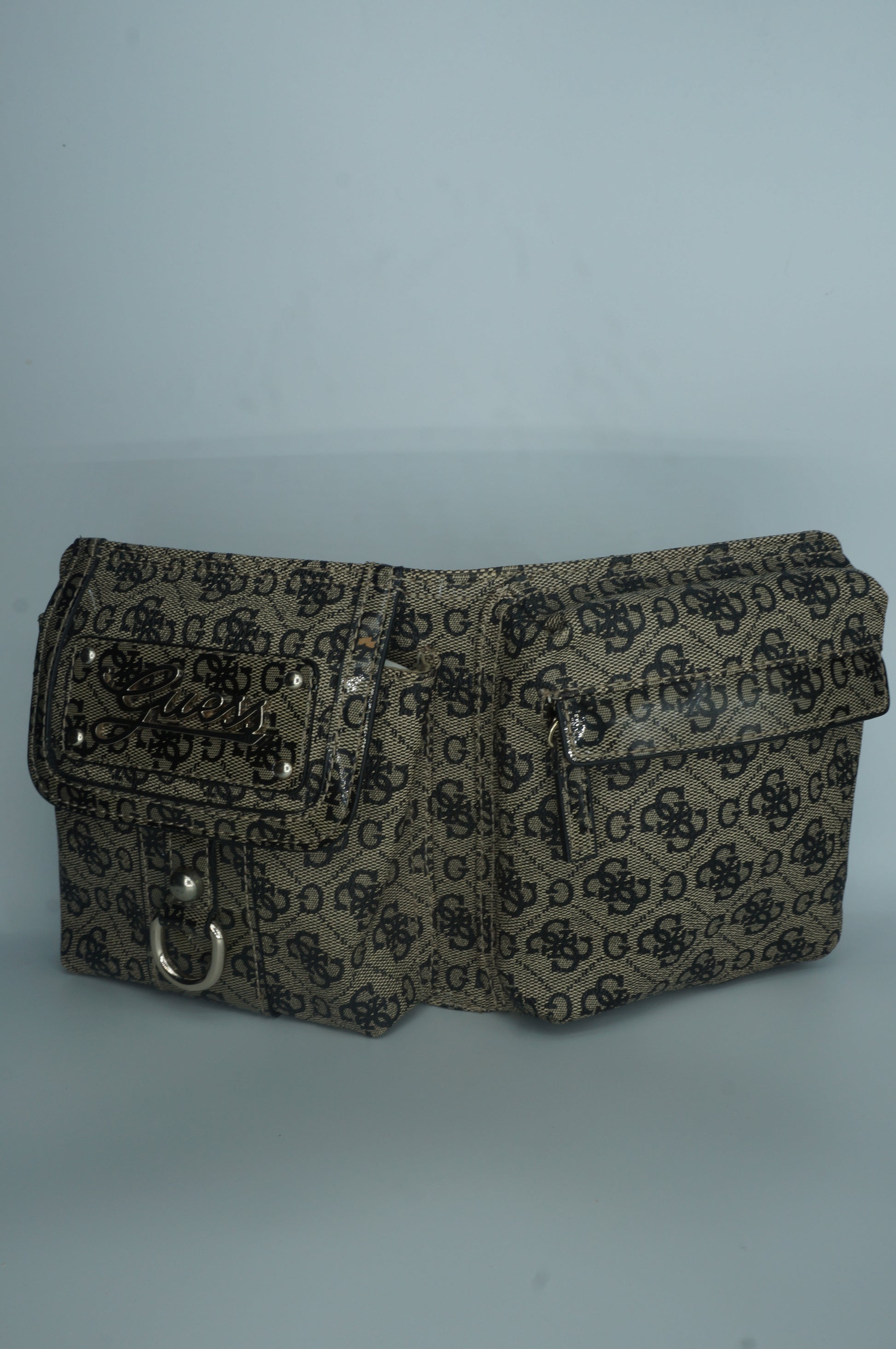 This grey and black monogram guess belt bag has two large front pockets. One with a zipper closure, the other with metal clasp closure and there’s an additional pocket featuring a zipper closure at the back.