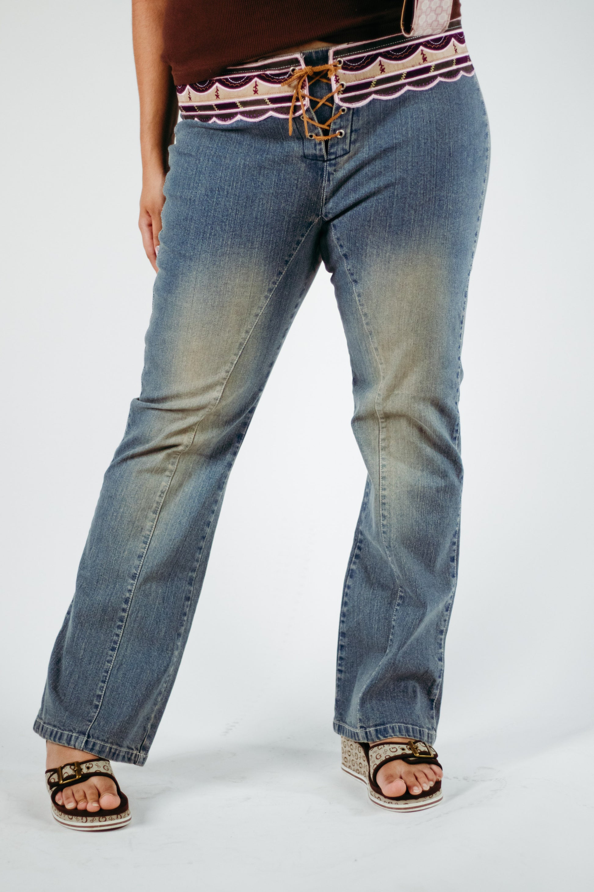 The perfect low rise jeans for a curvy Baddie. These have a lovely design at the waist and lace up.The bottoms are flared just how we like them and have no pockets at the back which gives the booty a plumper look.