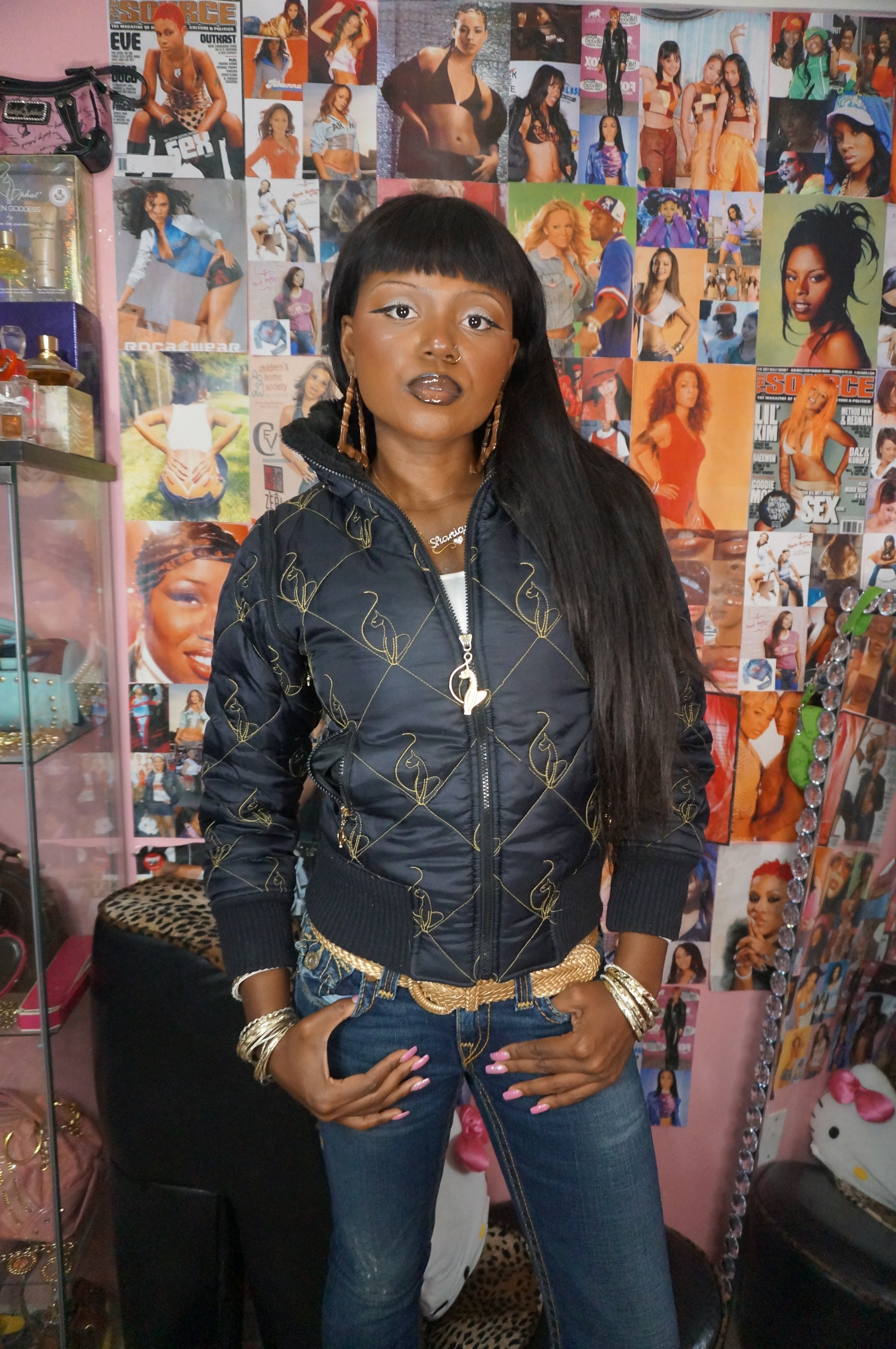 This jacket is soooo hot! This is the Hot Girl puffer jacket! This coat features the monogram cat logo with gold stitching. The sleeves are removable to be worn as a puffer vest. It also features the gold baby phat pendant for the zipper closure.