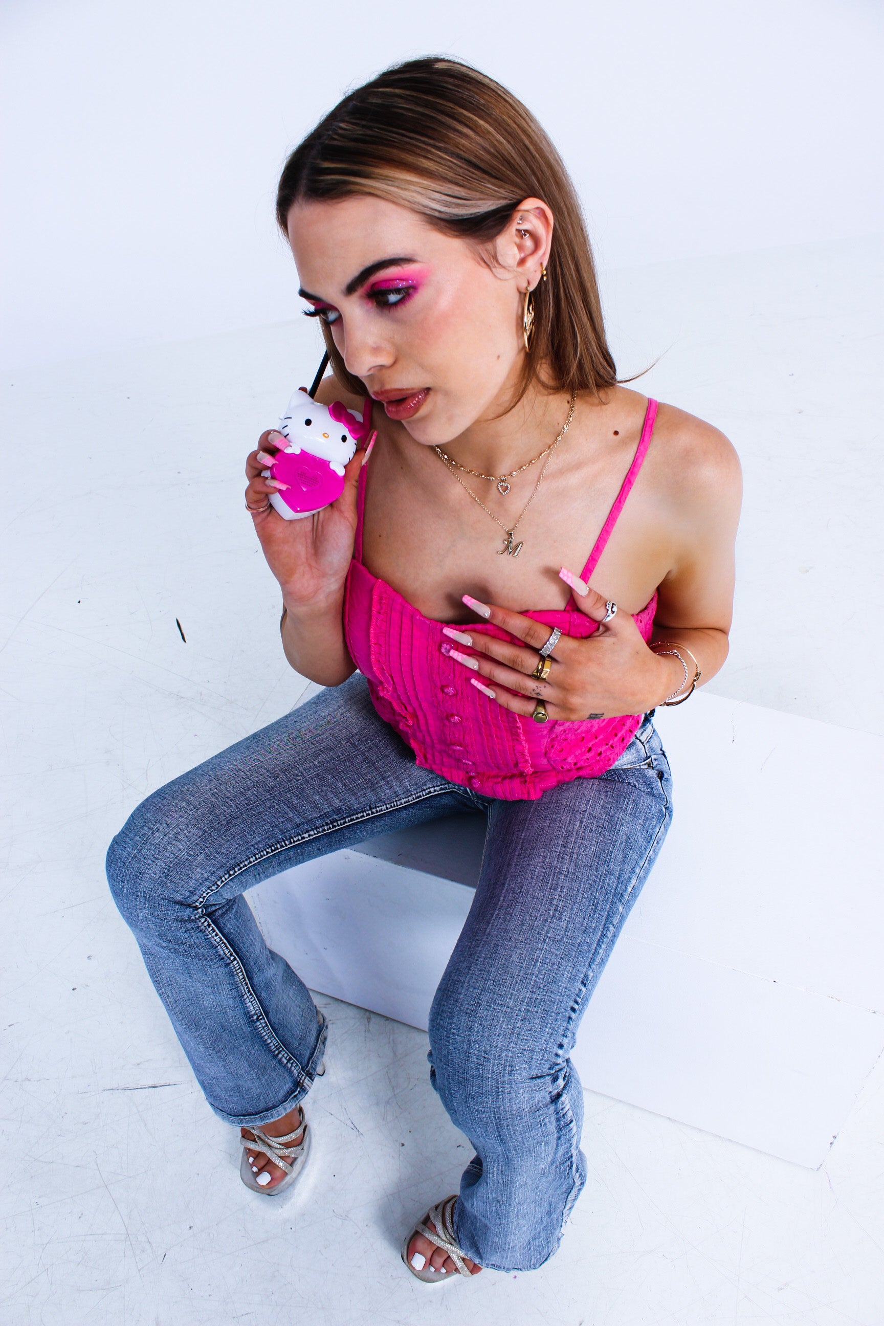 Pretty pink top with removable straps. Looks amazing with low rise jeans and stilettos or switch the bottoms for a mini skirt, a silver belt chain and white knee high stiletto boots.