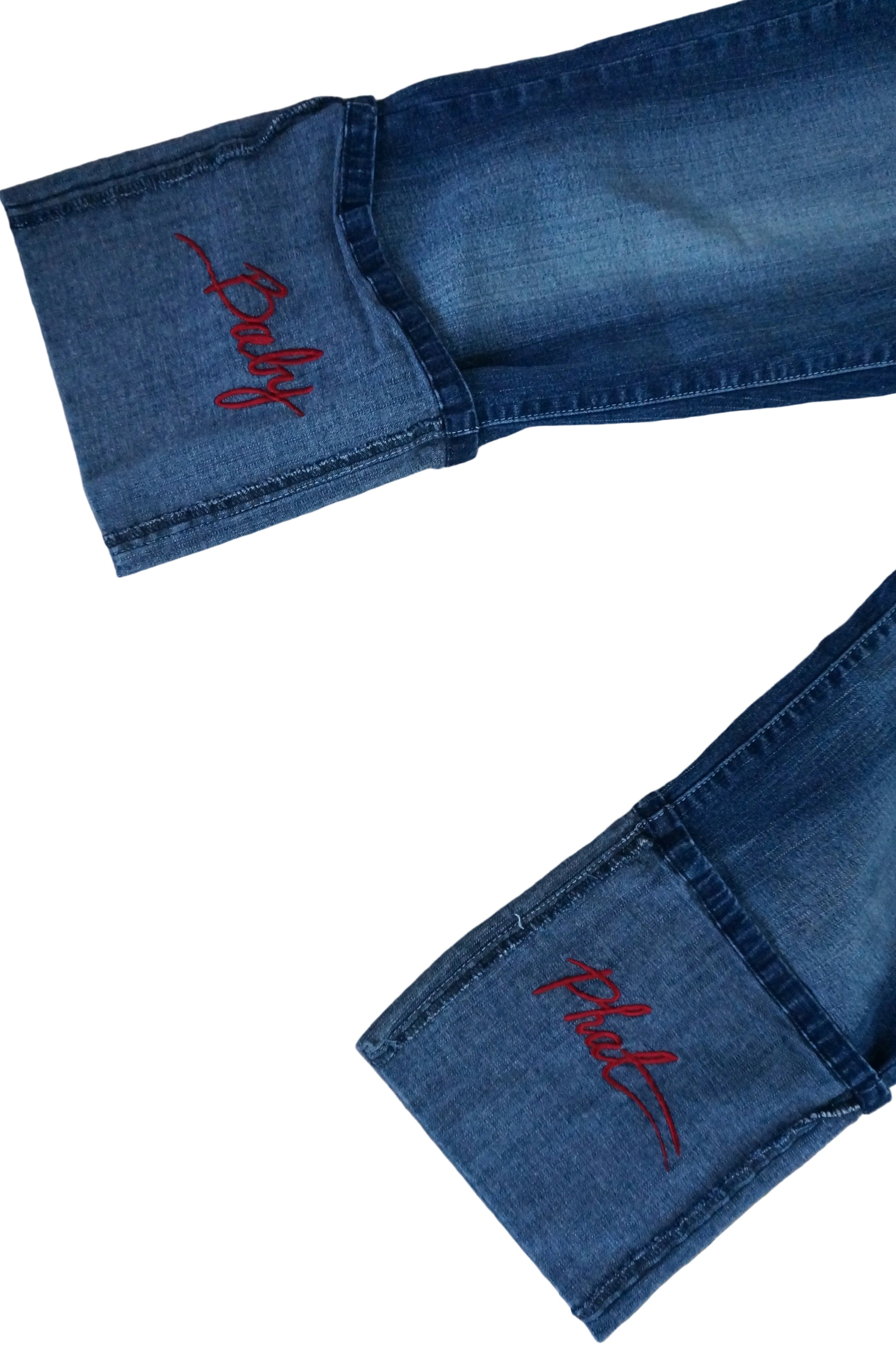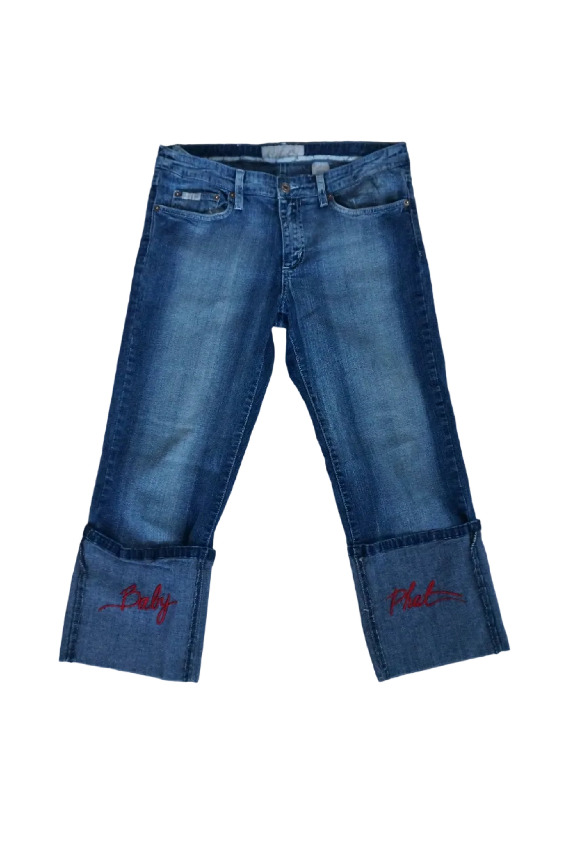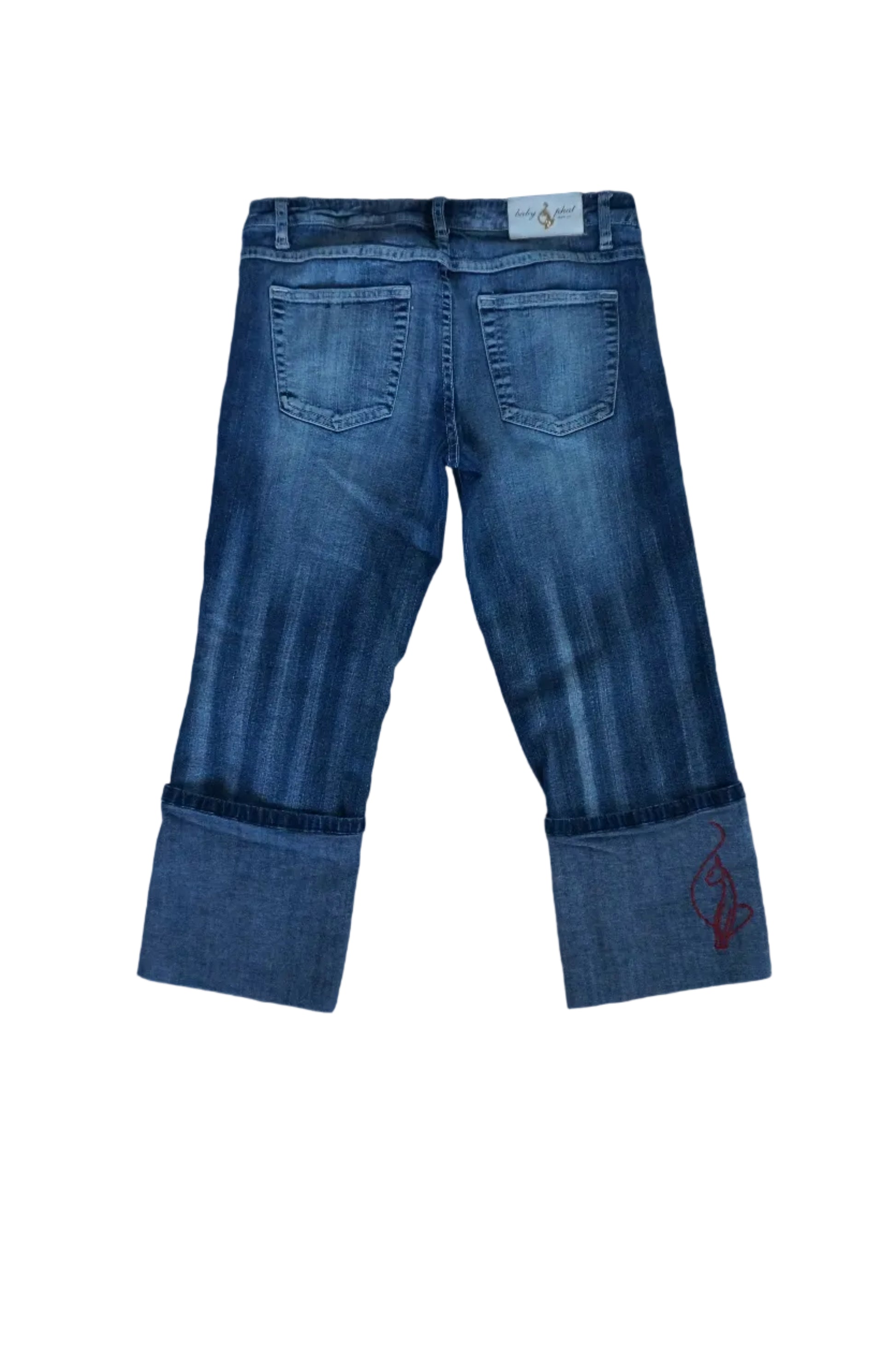 Rare Archive Baby Phat capris pants with Baby Phat spelled on the cuffs in red and the cat logo on the back leg in red.