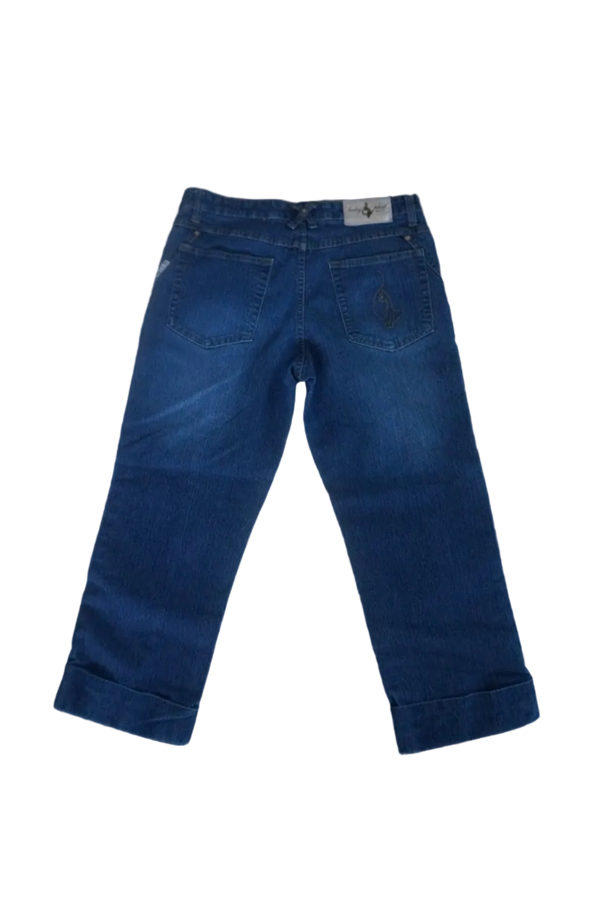 Archive mid wash Baby Phat capris pants with the cat logo on the back pocket.