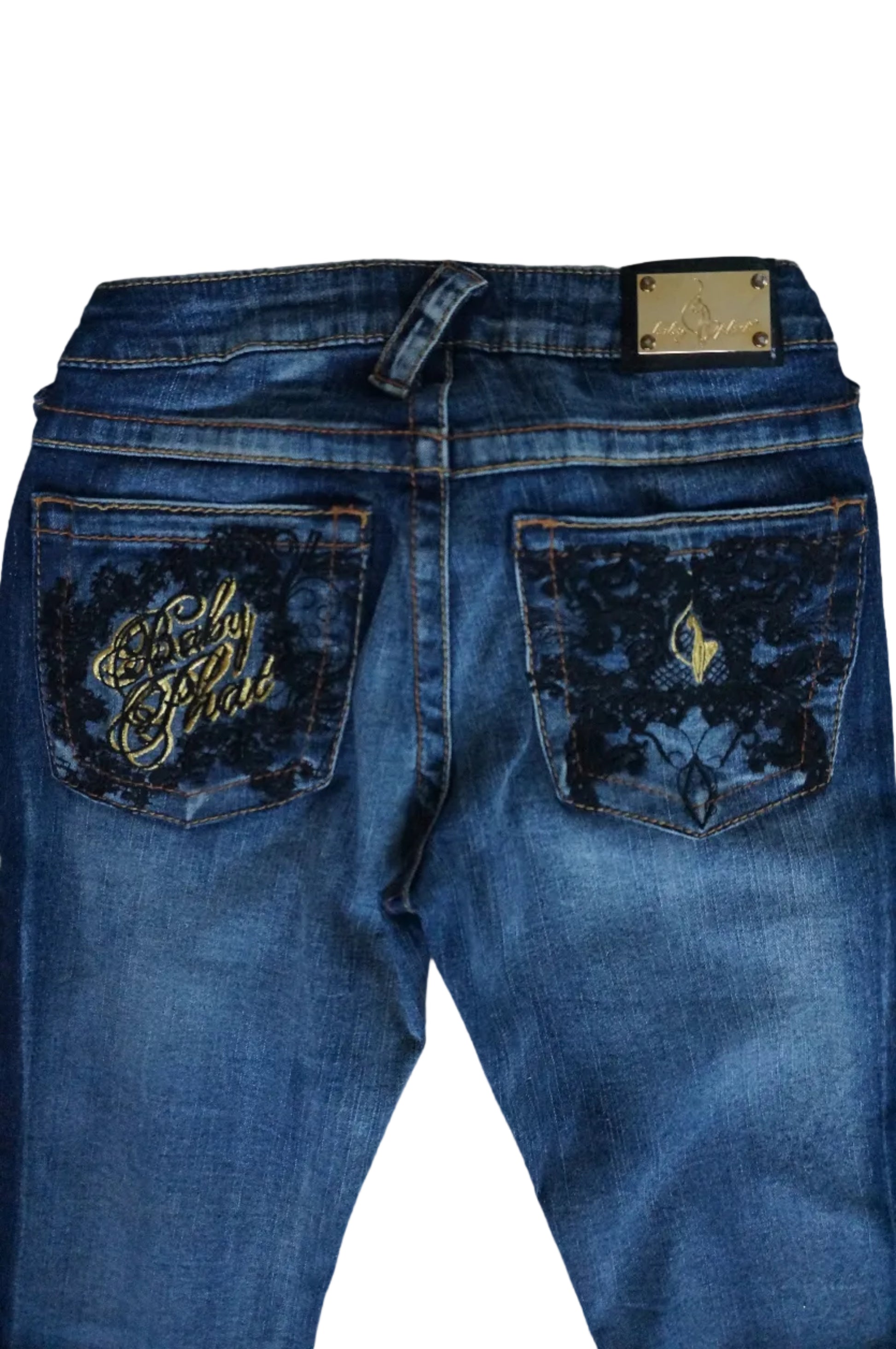 Archive Baby Phat skinny jeans with mesh detailing on the back pockets, the cat logo on one side and Baby Phat spelled out on the other in gold. Achieve the video vixen look with these babies right here!