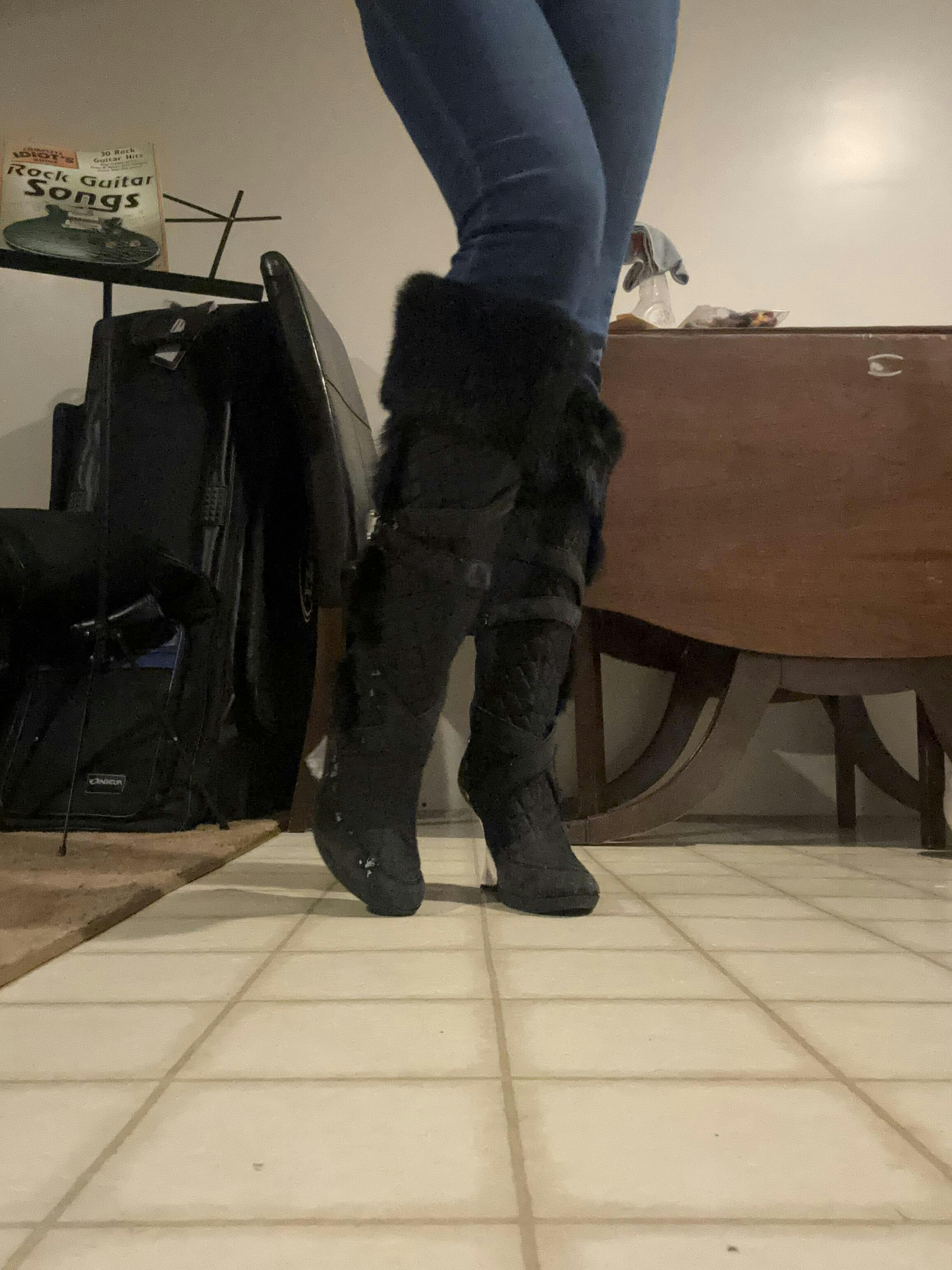 Archive black quilted Baby Phat knee high wedge boots with fur trim and silver detailing.