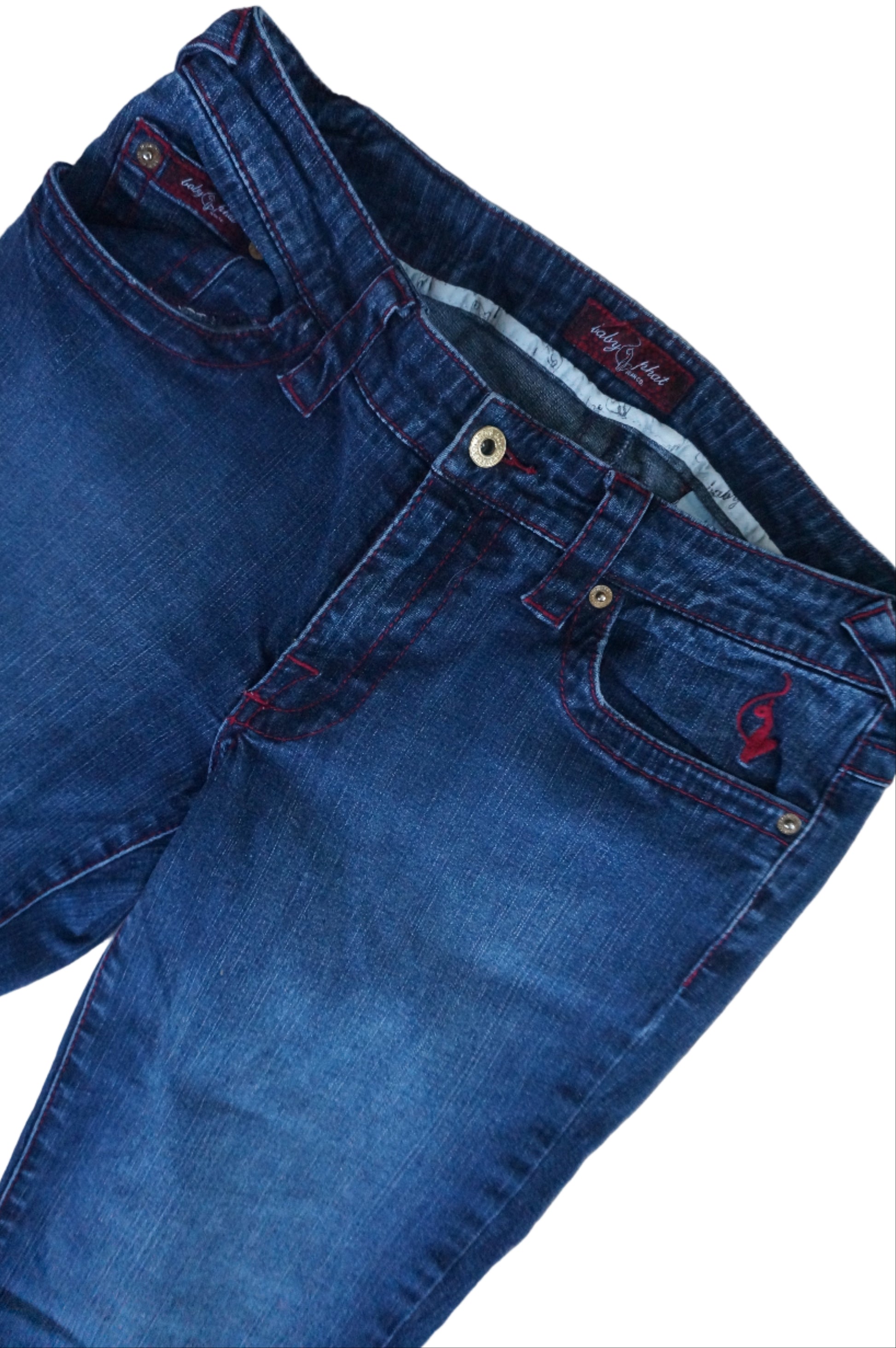 Vintage archive Baby Phat jeans with red cat logo embroidered on the back pocket with black and grey designs.
