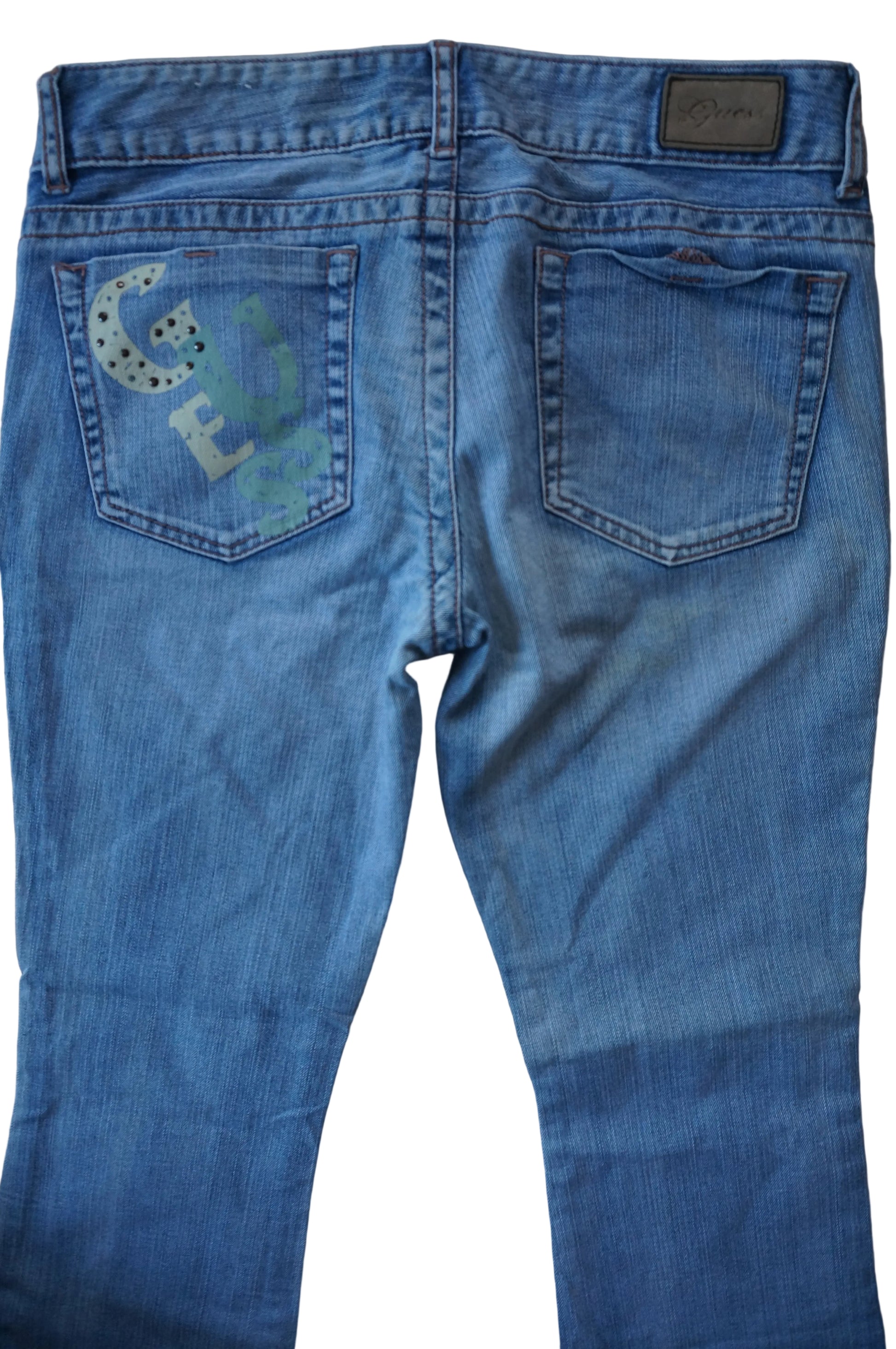 Archive video vixen coded low rise light wash guess jeans with guess printed on the back pocket in cream and green.
