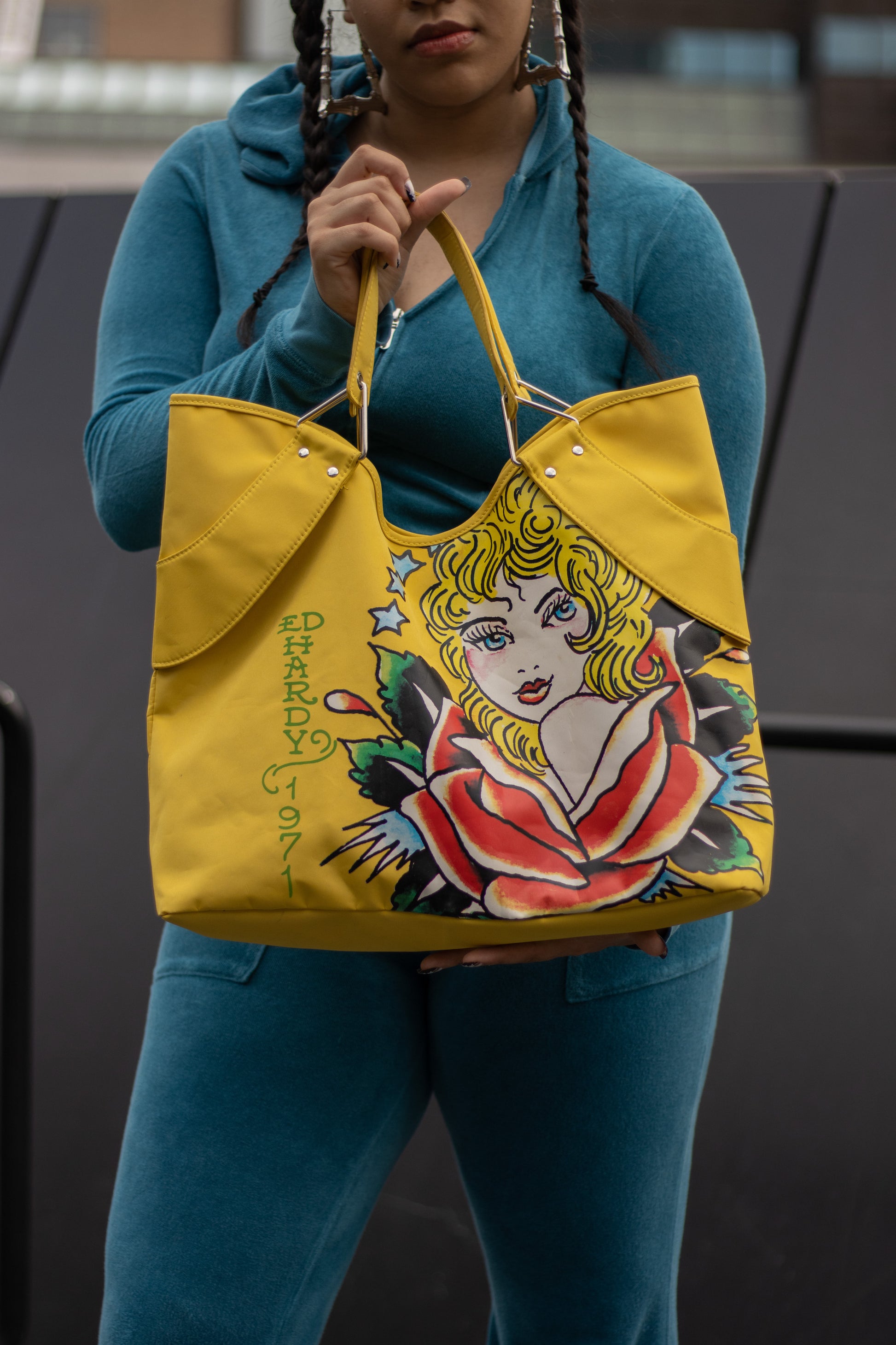 Bright Yellow Ed Hardy tote bag. The colour instantly makes your oufit pop! This tote is very spacious and perfect for school or an everyday BAG. Wearing Ed Hardy in the mid 2000s was a flex , don't sleep!